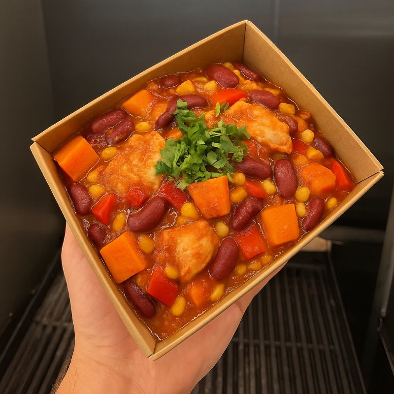 with yams, kidney beans, red bell peppers, sweet onions, Rosie's organic chicken, and corn. Slow cooked in fresh cumin, coriander, red sauce, and paprika for 8 hours. Topped with fresh cilantro (P:40g F:12g C:52g)= 476 calories