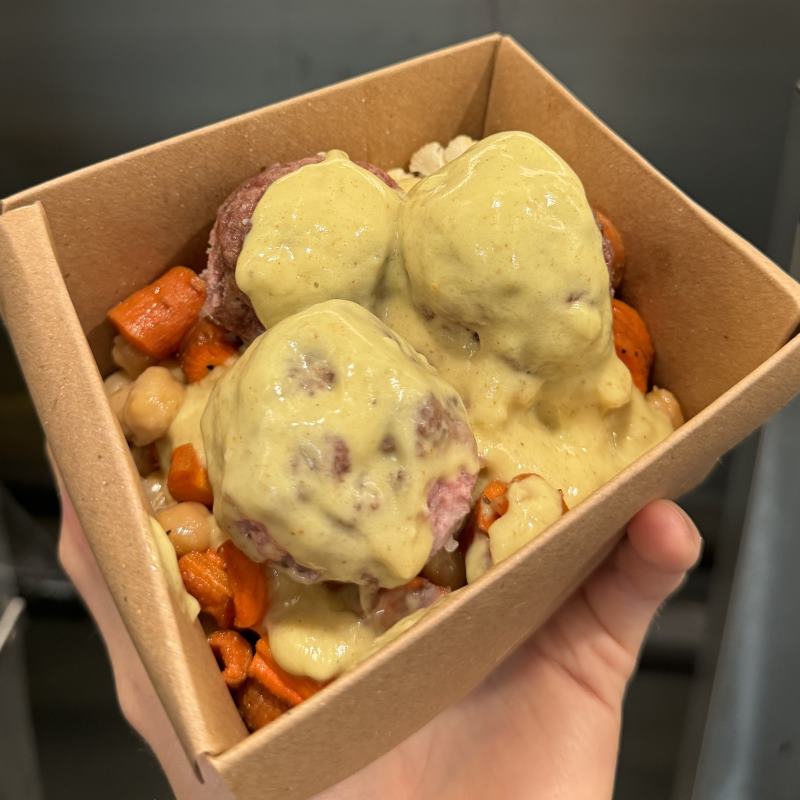 with white jasmine, rice, sauté garbanzo beans, garlic cauliflower, roasted carrots, snow peas, Niman Ranch lamb meatballs, and topped with our house made curry sauce (P:41g F:27g C:43g)= 663 calories
