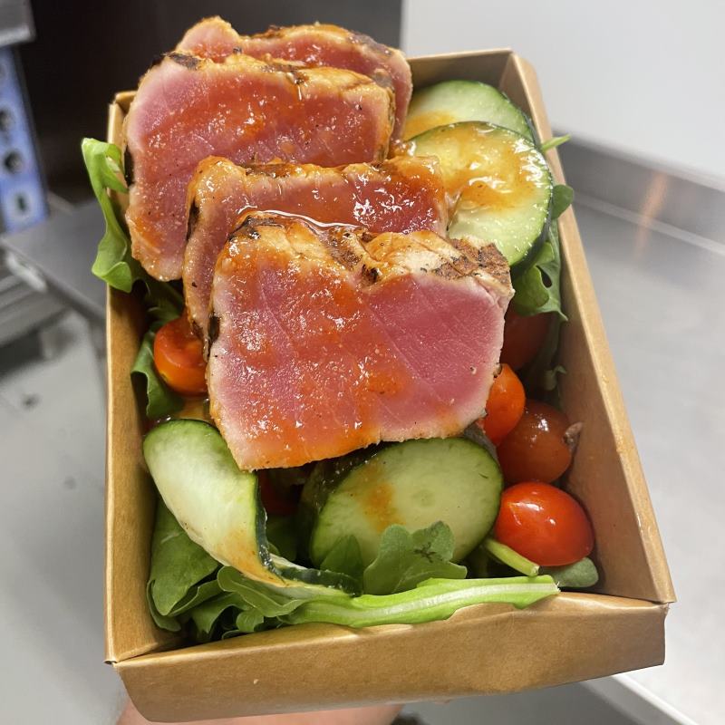 with golden quinoa, fresh arugula, cucumbers, blistered cherry tomatoes, wild caught albacore tuna from Purefish, and topped with our house made Moroccan sauce (P:35g F:15g C:40g)= 435 calories