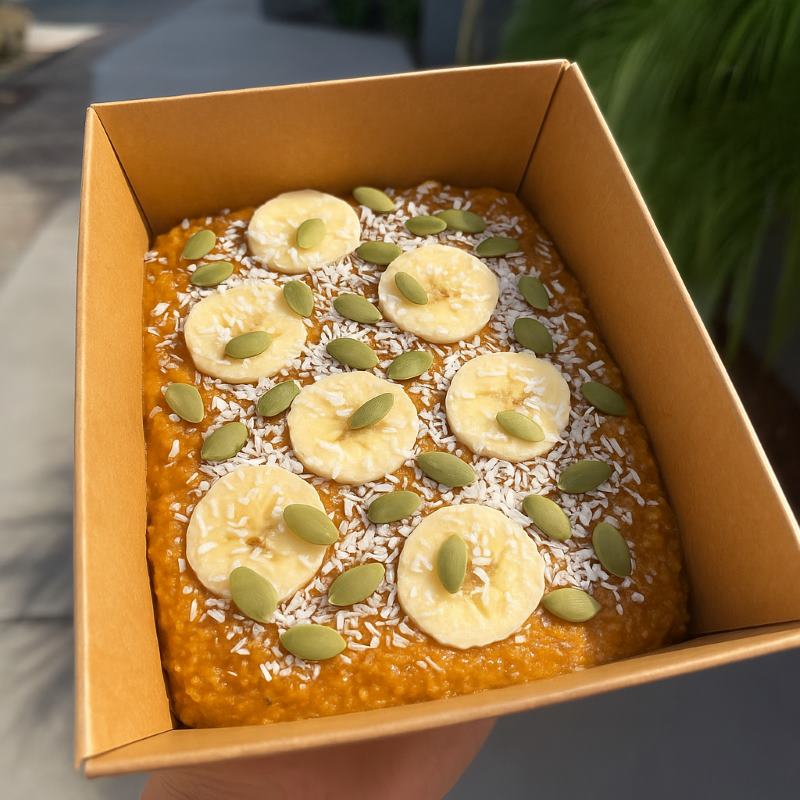 with chia seeds, fresh coconut milk, Organifi complete vanilla vegan protein powder, cinnamon, no sugar pumpkin pure, local raw San Diego honey, sunflower seed butter, banana slices, and topped with coconut flakes (P:37g F:26g C:30g)=502 calories